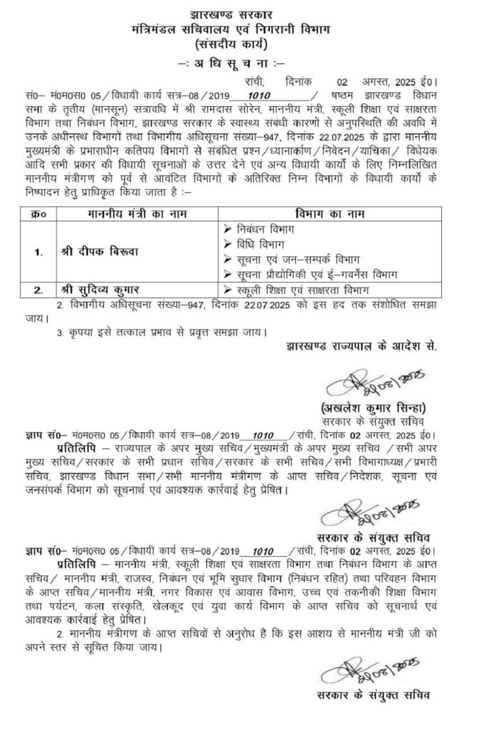 रांची. झारखंड के शिक्षा मंत्री रामदास सोरेन की स्थिति नाजुक है। अपोलो हॉस्पिटल की ओर से जारी मेडिकल बुलेटिन में बताया गया है की रामदास सोरेन को लाइफ सपोर्ट सिस्टम पर रखा गया है। रामदास सोरेन की अनुपस्थिति में विधानसभा के मानसून सत्र के दौरान स्कूली शिक्षा एवं साक्षरता विभाग का कार्यभार मंत्री सुदिव्य कुमार सोनू को दिया गया है। इसकी अधिसूचना जारी कर दी गयी है।