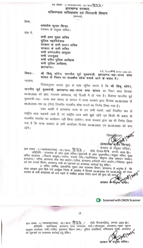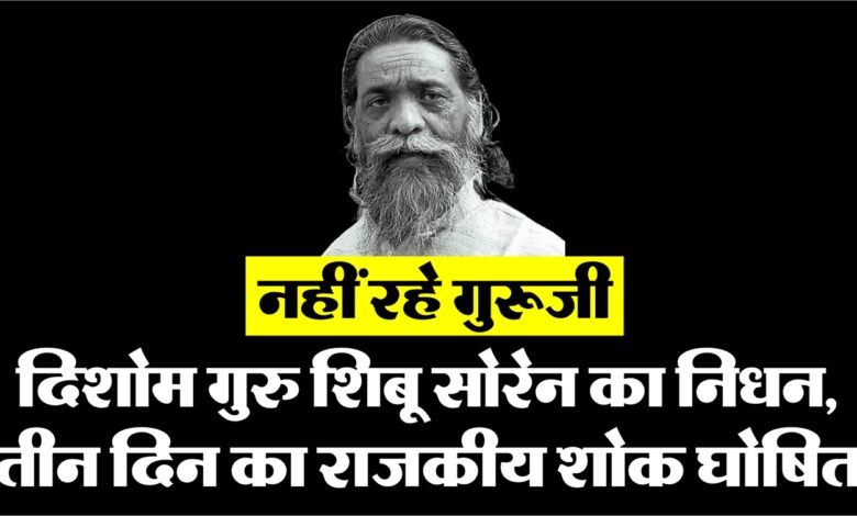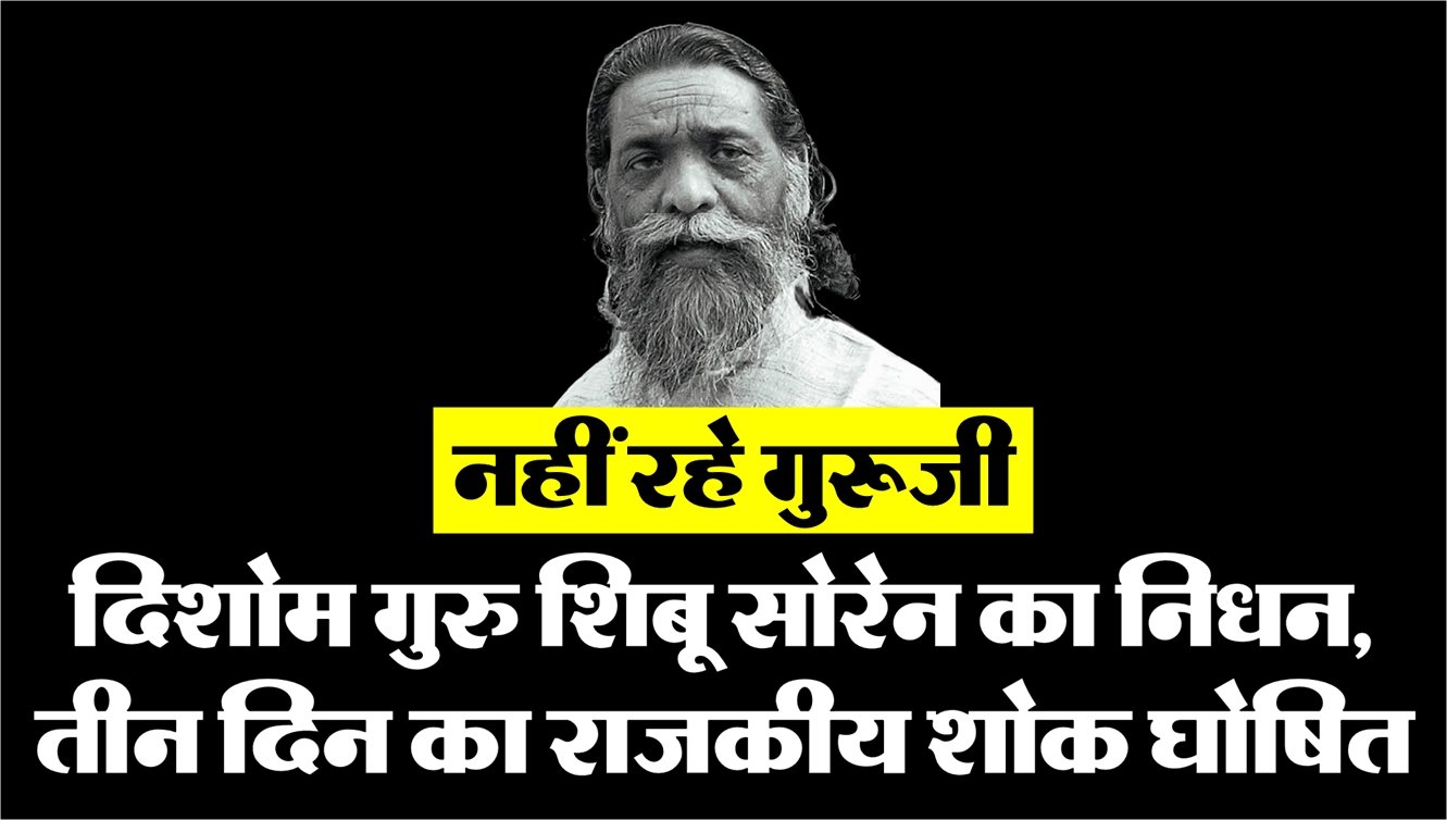 रांची. आदिवासी जननायक दिशोम गुरु शिबू सोरेन का आज सुबह 8:56 बजे निधन हो गया। उन्होंने दिल्ली के सर गंगा राम अस्पताल में अंतिम सांस ली। अचानक तबीयत बिगड़ने के बाद उन्हें अस्पताल में भर्ती कराया गया था। दिशोम गुरु के निधन से झारखंड में तीन दिन का राजकीय शोक घोषित किया गया है। राज्य के सभी सरकारी कार्यालय 4 और 5 जुलाई को बंद रहेंगे। विधानसभा के मानसून सत्र की कार्यवाही को भी अनिश्चितकाल के लिए स्थगित कर दिया गया है। गुरूजी के निधन पर राष्ट्रपति द्रौपदी मुर्मू, प्रधानमंत्री नरेंद्र मोदी समेत देश के बड़े नेताओ ने शोक प्रकट किया है।