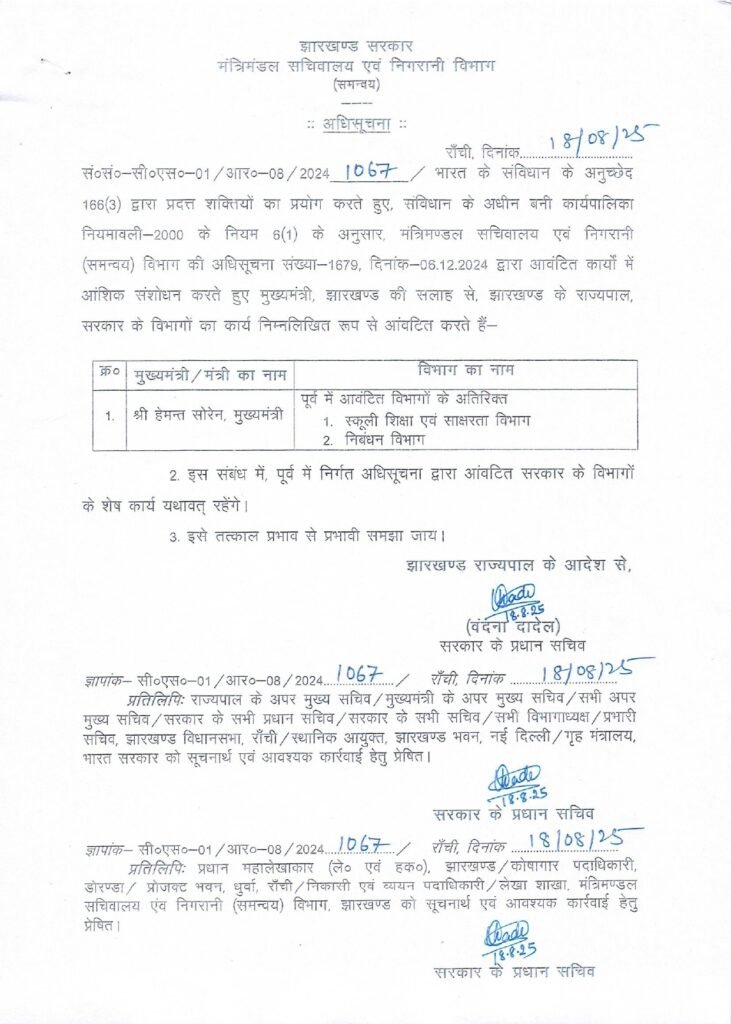 सीएम हेमंत सोरेन संभालेंगे स्कूली शिक्षा एवं साक्षरता विभाग और निबंधन विभाग की कमान