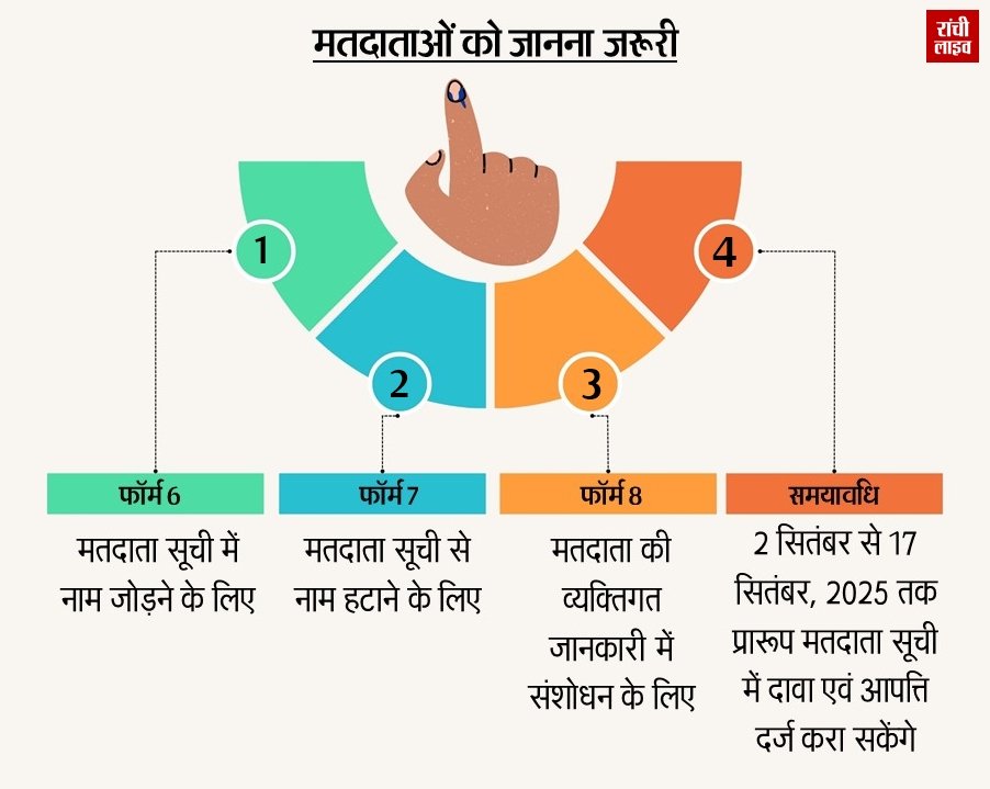 के. रवि कुमार ने बताया कि घाटशिला विधानसभा क्षेत्र में मतदाता सूची के विशेष पुनरीक्षण कार्यक्रम के तहत 1200 से अधिक मतदाताओं वाले मतदान केंद्रों का युक्तिकरण किया गया है। जिसके बाद विधानसभा क्षेत्र में मतदान केंद्रों की संख्या बढ़कर 300 हो गई है। इस संदर्भ में सभी मान्यता प्राप्त राजनीतिक दलों से बैठक एवं अन्य नियमानुसार कार्रवाई की गई है। उन्होंने बताया कि ​प्रारूप मतदाता सूची का प्रकाशन 2 सितंबर, 2025 (मंगलवार) को किया जा रहा है, प्रारूप मतदाता सूची में दावा एवं आपत्ति जमा करने की अवधि 2 सितंबर, 2025 से 17 सितंबर, 2025 तक है मतदाता सूची में नाम जोड़ने के लिए फॉर्म–6, हटाने के लिए फॉर्म–7 एवं संशोधन के लिए फॉर्म–8 जमा किए जा सकते हैं। ​मतदाता सूची का अंतिम प्रकाशन 29 सितंबर, 2025 (सोमवार) को किया जाएगा।