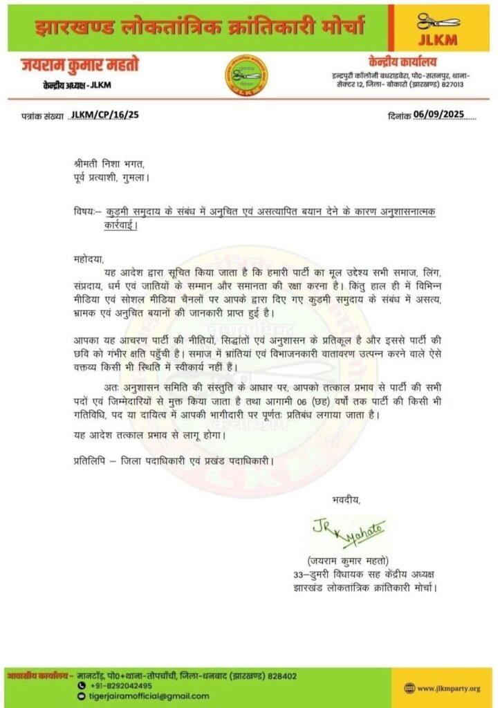 कुड़मी समाज को लेकर दिए बयान के बाद निशा भगत JLKM से बाहर, जयराम महतो ने लिया फैसला, निशा बोली – पहले पार्टी छोड़ती तो कुर्मियों के मानसिकता का पता नहीं चलता, उम्मीद है कि सबको जयराम महतो की मानसिकता का पता चल गया होगा