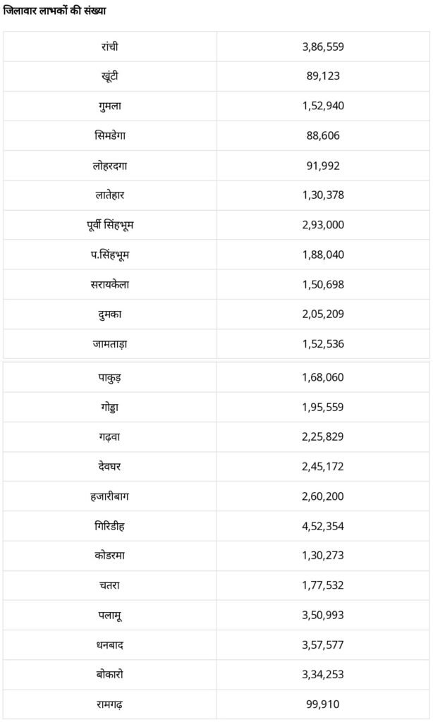सभी 24 जिलों में पांच जिले जहां लाभुकों की संख्या सबसे ज्यादा है. इनमें पहले स्थान पर है गिरिडीह जिला. दूसरे स्थान पर रांची, तीसरे स्थान पर धनबाद, चौथे स्थान पर पलामू और पांचवें स्थान पर बोकारो जिला है. सबसे कम लाभुकों की संख्या सिमडेगा में 88,606 है.