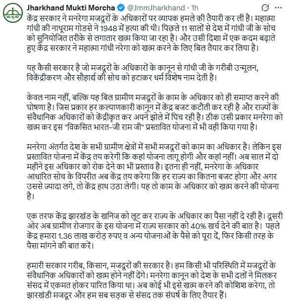 रांची: मनरेगा का नाम बदलने संबंधी केंद्र सरकार के बिल का झारखंड मुक्ति मोर्चा ने विरोध किया है। झामुमो ने अपने एक्स हैंडल पर लिखा कि केंद्र सरकार ने मनरेगा मजदूरों के अधिकारों पर व्यापक हमले की तैयारी कर ली है। महात्मा गांधी की नाथूराम गोडसे ने 1948 में हत्या की थी। पिछले 11 सालों से देश में गांधी जी के सोच को सुनियोजित तरीके से लगातार खत्म किया जा रहा है। और उसी दिशा में एक कदम बढ़ाते हुए केंद्र सरकार ने महात्मा गांधी नरेगा को खत्म करने के लिए बिल तैयार कर लिया है।