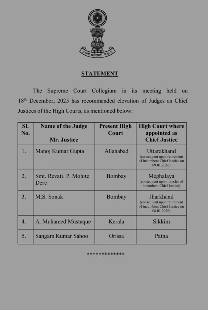 रांची: बांबे हाई कोर्ट के जस्टिस महेश शरदचंद्र सोनक झारखंड हाई कोर्ट के नए चीफ जस्टिस होंगे। सुप्रीम कोर्ट कोलेजियम ने आज उनके नाम की अनुशंसा केंद्र सरकार को भेजी है। झारखंड हाई कोर्ट के चीफ जस्टिस तरलोक सिंह चौहान आठ जनवरी को सेवानिवृत्त हो रहे हैं। उनकी सेवानिवृत्ति के बाद जस्टिस एमएस सोनक चीफ जस्टिस बनाए जाएंगे। वह बांबे हाई कोर्ट के दूसरे वरीयतम जज हैं।