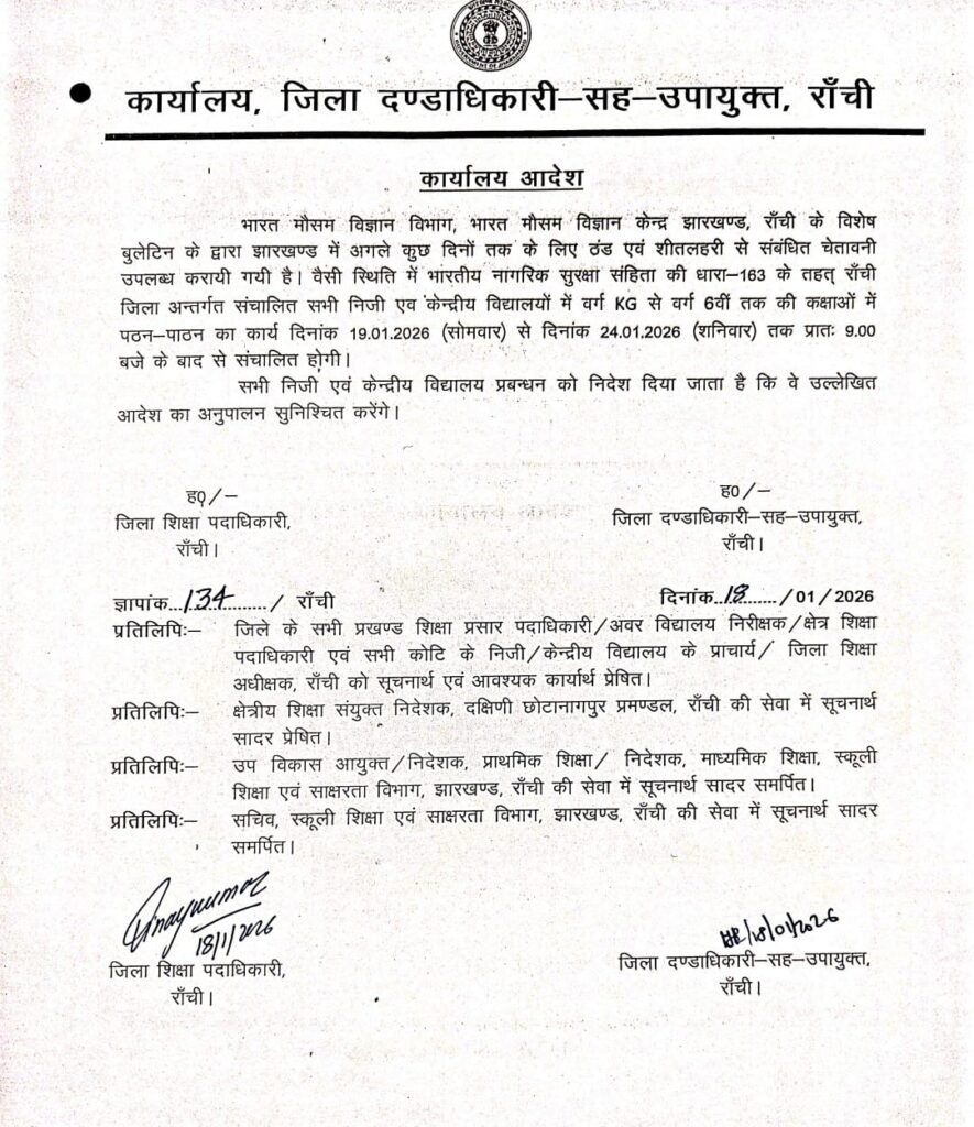 रांची: झारखंड में बढ़ती ठंड और शीतलहर की स्थिति को देखते हुए भारत मौसम विज्ञान विभाग, रांची द्वारा विशेष बुलेटिन जारी किया गया है। इसके मद्देनज़र उपायुक्त सह जिला दंडाधिकारी रांची श्री मंजूनाथ भजंत्री ने निर्देश जारी करते हुए कहा है कि रांची जिले के सभी निजी एवं केंद्रीय विद्यालयों में वर्ग KG से 6वीं तक की कक्षाएं अब प्रातः 9:00 बजे के बाद से संचालित की जाएंगी। यह आदेश दिनांक 19 जनवरी 2026 (सोमवार) से 24 जनवरी 2026 (शनिवार) तक प्रभावी रहेगा।